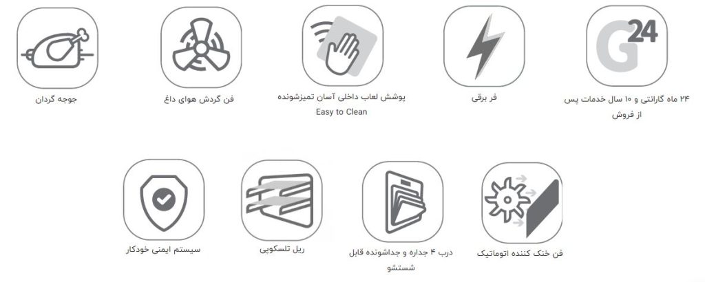 این فر با استفاده از ریل تلسکوپی، فرایند خارج کردن غذای آماده از فر را ساده تر میکند و انگشتان دست شما کمترین تماس با بدنه داخل فر خواهد داشت. این ویژگی مهم به واسطه بدنه نسوز و مقاوم در برابر حرارت آن فراهم شده است.