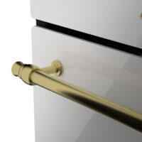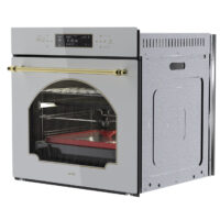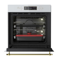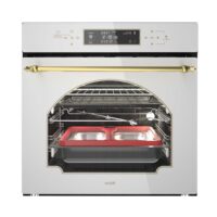 فر توکار V۵۰۶W با رنگ سفید و نوار طلایی، نمایی لوکس و متفاوت به آشپزخانهی شما میبخشد. این ترکیب رنگی زیبا، ضمن هماهنگی با انواع سبکهای دکوراسیون، نمادی از ظرافت و مدرنیته است. ابعاد بیرونی این فر ۵۹*۵۵*۵۹ سانتیمتر بوده و به راحتی در کابینتهای استاندارد جا میگیرد. شیشهی سکوریت مقاوم در برابر حرارت و طراحی مینیمال، زیبایی این محصول را دوچندان میکند.