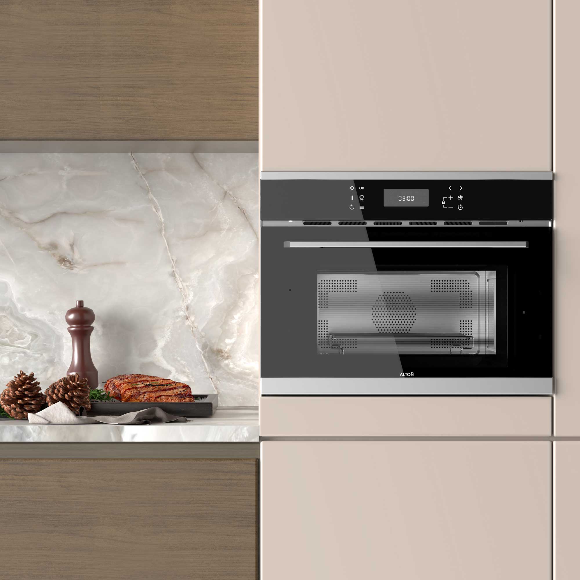 نتیجهی کار؟ پیتزایی با لایهی پنیر برشته، مرغی طلایی و نان خانگی کاملاً پفکرده. این همان ترکیب تکنولوژی و زیبایی در آشپزخانه است که آلتون همیشه به آن پایبند بوده است.