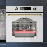 فر توکار V۵۴۰W با رنگ سفید شیک و نوار طلایی ظریف، ترکیبی از مدرنیته و اصالت را به آشپزخانه شما هدیه میدهد. طراحی کلاسیک ولومهای تاجدار آن، جذابیتی خاص به محیط آشپزی شما میبخشد و نشاندهنده هماهنگی کامل با سلیقه ایرانی است.