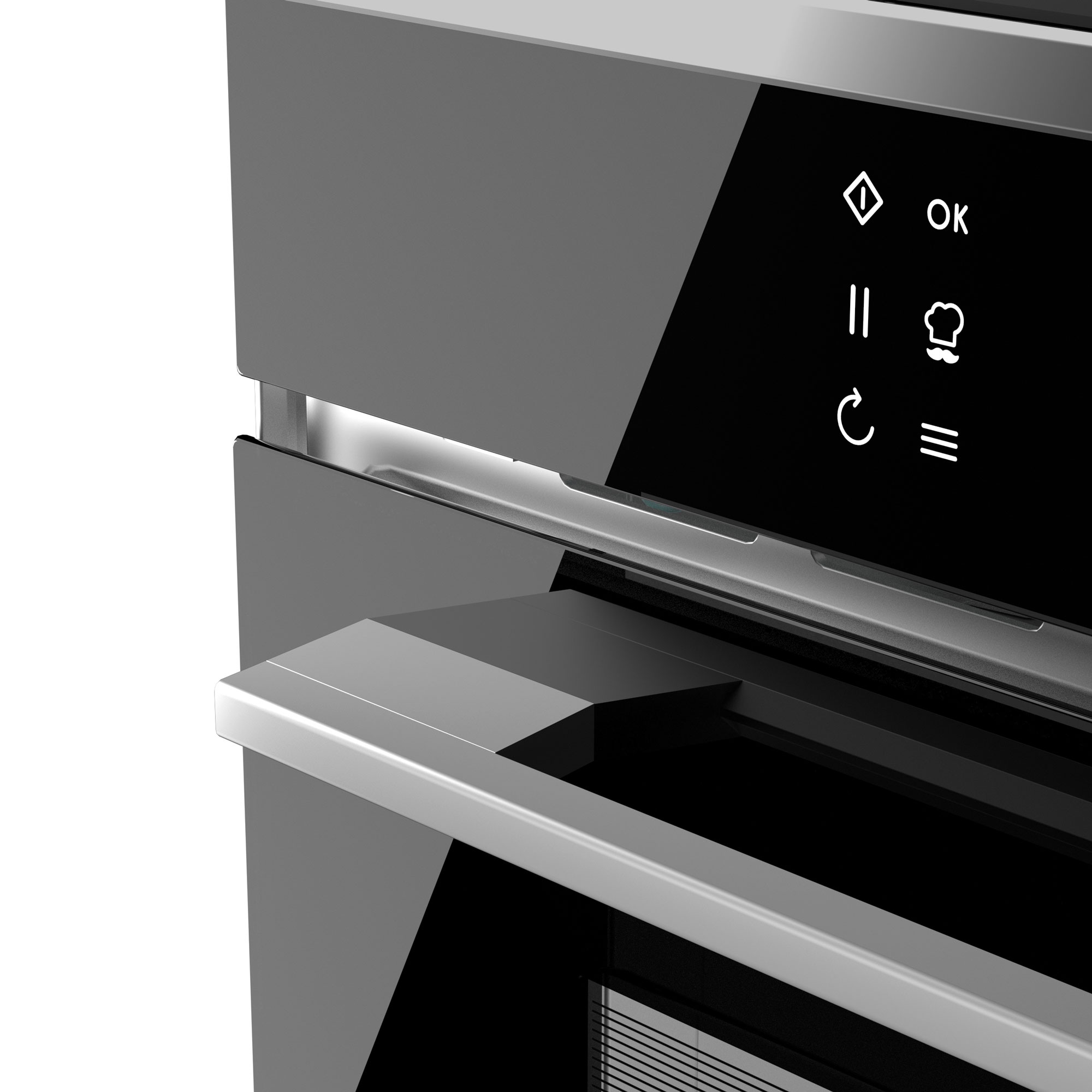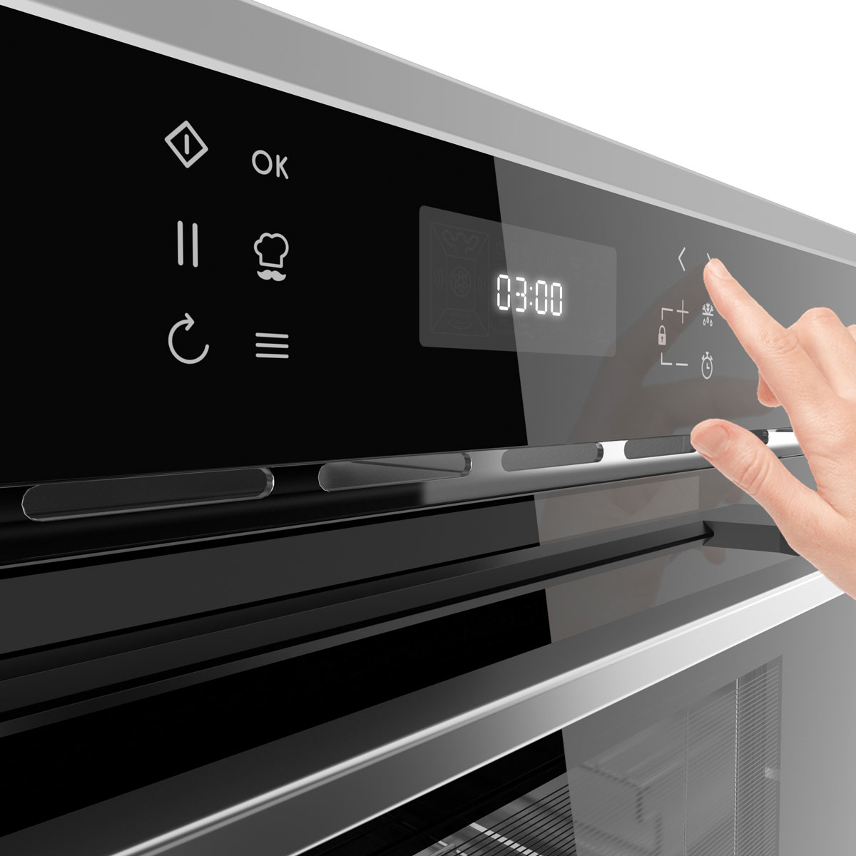 نمای جلویی با صفحه کنترل لمسی و دستگیره آلومینیومی تکا حس یک محصول لوکس اروپایی را تداعی میکند. ترکیب استیل و شیشه ایرانی مقاوم، ظاهری چشمنواز و حرفهای به آن داده که با هر دکوراسیونی سازگار است.