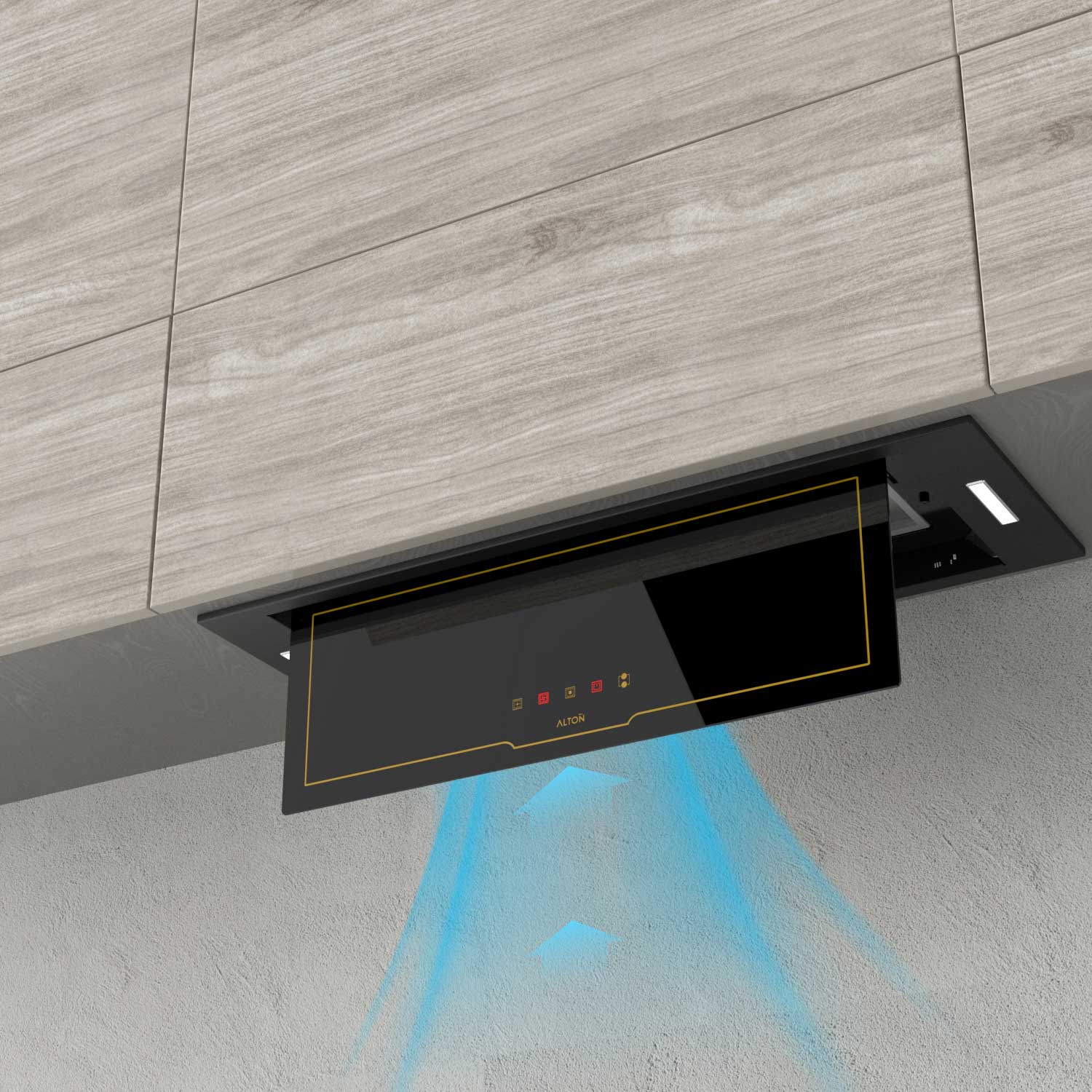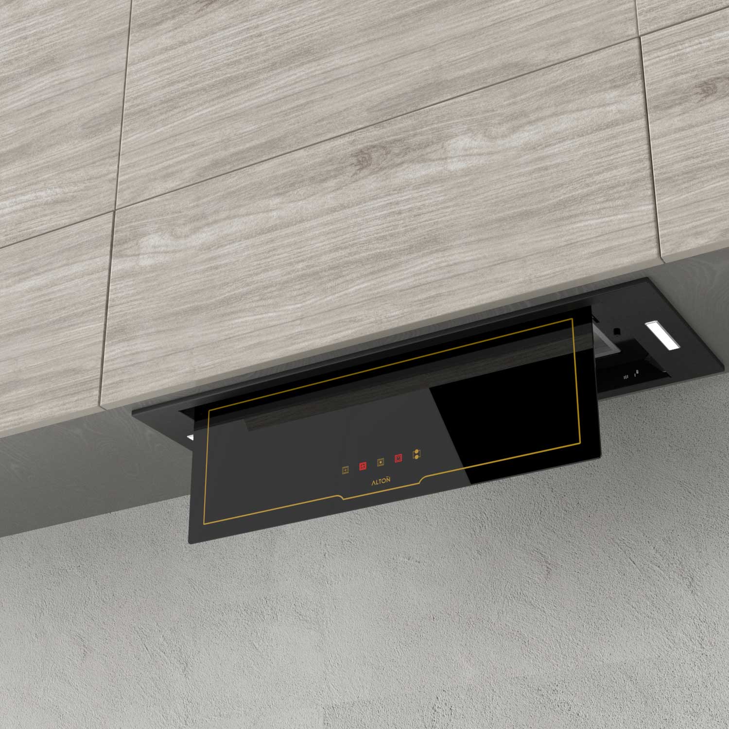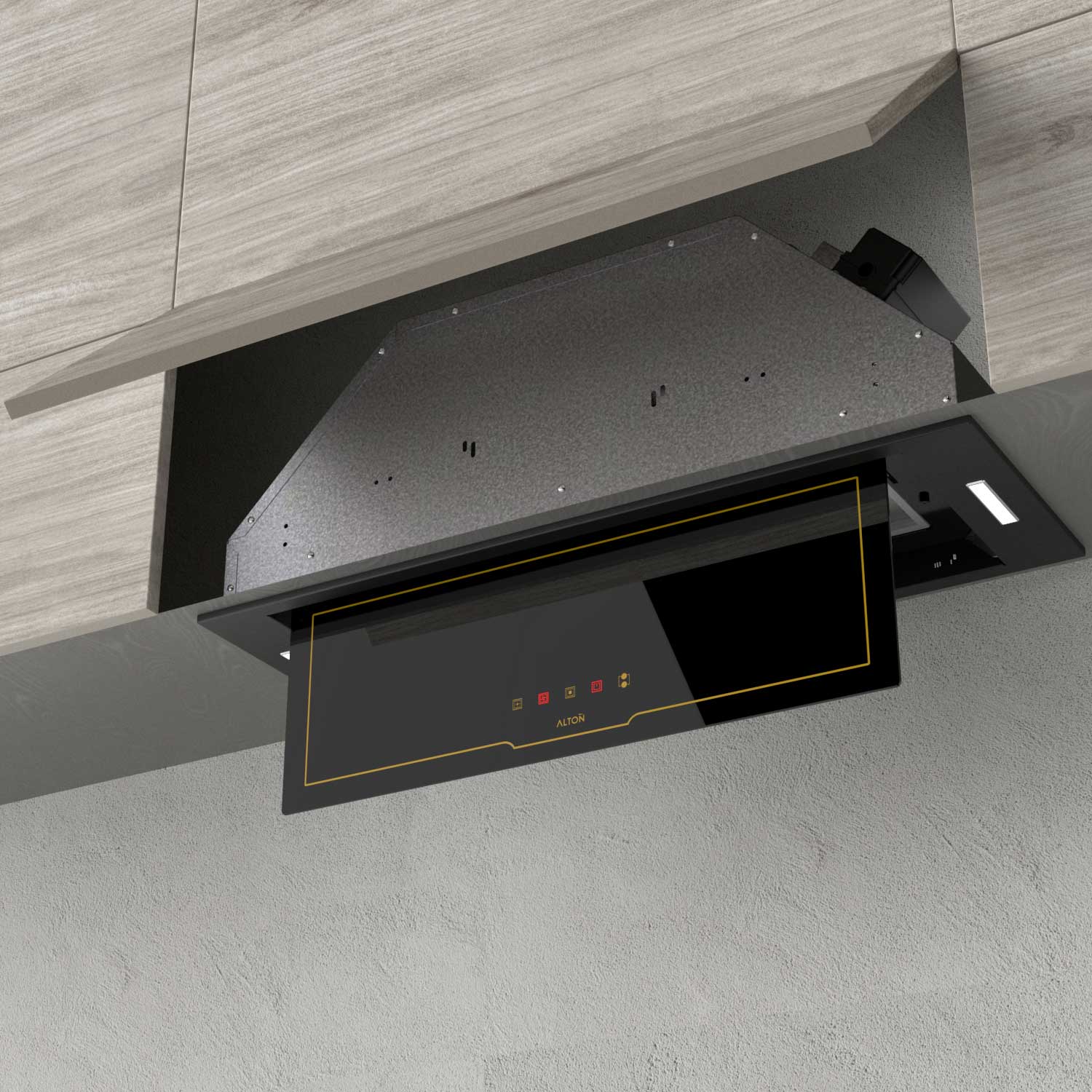 هود H۸۰۴BN با ترکیب رنگ مشکی اپتیک و خطوط طلایی، جلوهای لوکس و مدرن دارد که با انواع کابینتها و دکوراسیونهای کلاسیک و امروزی هماهنگ میشود. این هود از نوع مخفی است، به این معنا که داخل کابینت نصب شده و ظاهری یکپارچه به فضای آشپزخانه میدهد. این ویژگی، علاوه بر زیبایی، باعث بهینهسازی فضا نیز میشود.